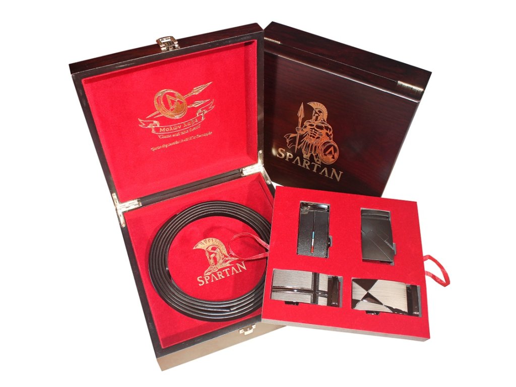 Prémiová luxusní dvoupatrová sada Opasků Spartan v dřevěné kazetě. BOX č.S2