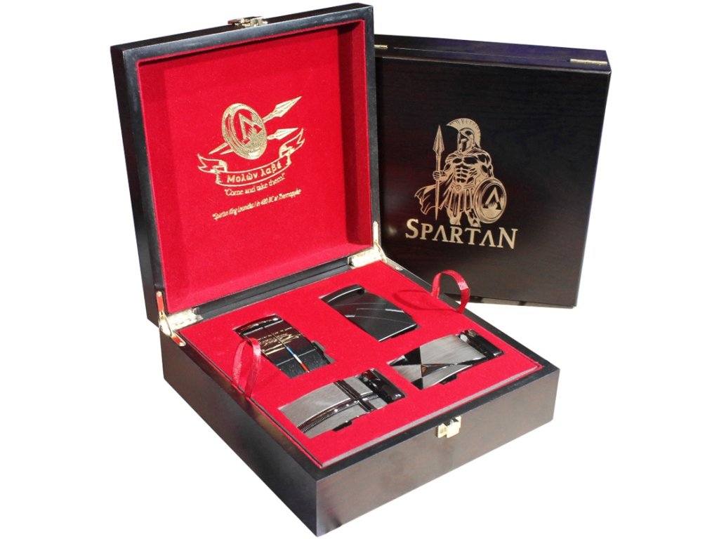 - Luxusní krabička: Pevná dřevěná krabička s červeným polstrováním, doplněná reliéfním logem Spartan brave warrior, ideální pro vystavení nebo darování.