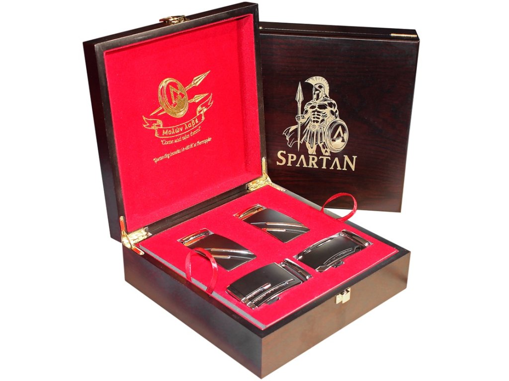 - Luxusní krabička: Pevná dřevěná krabička s červeným polstrováním, doplněná reliéfním logem Spartan brave warrior, ideální pro vystavení nebo darování.