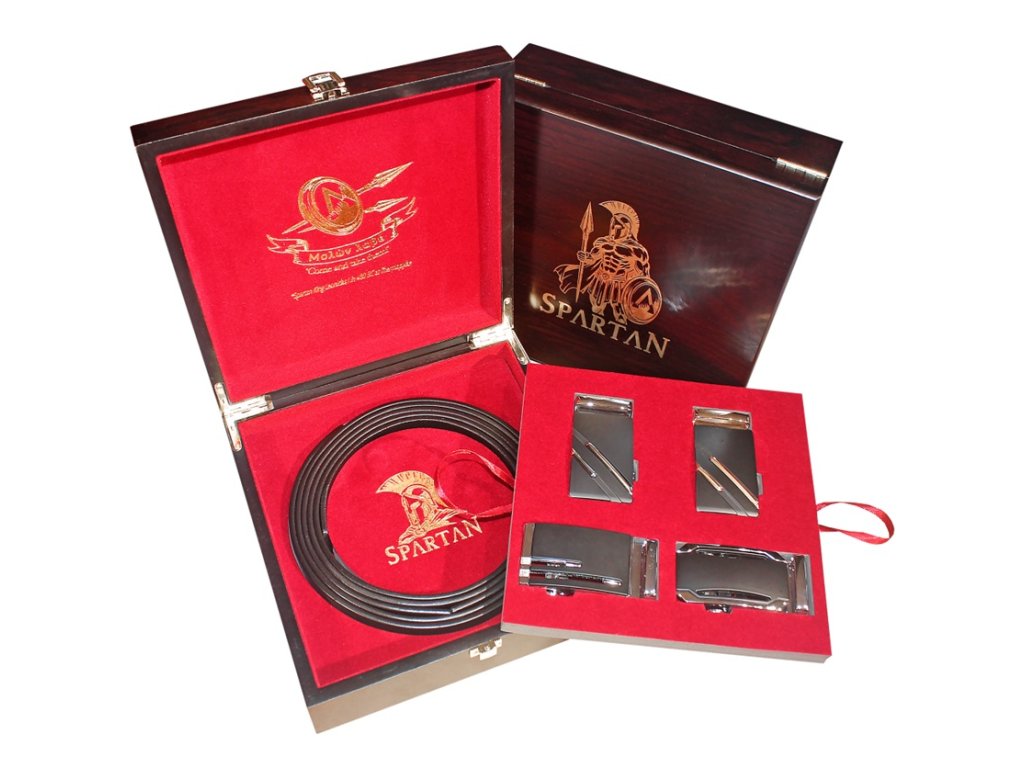 Prémiová luxusní dvoupatrová sada Opasků Spartan v dřevěné kazetě. BOX č.S4